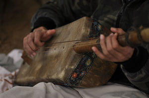 A term referring both to a North African ethnic group, as well as a ritual musical style and ceremony performed by maâlem (master musicians), traditionally on the qraqab (heavy iron castanets) and the gimbri (three-string lute).