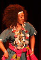 Very slowly Temesgen started to tune up the main krar which seamlessly led us into a haunting piece entitled “Zelesegun”. Robel’s kebero drums came in holding down the sombre atmosphere and Genet slowly walked on in a deep indigo-blue cape embroidered in gold over a dark blue gold-edged floor-length gown all topped off with her huge afro and started singing, whilst remaining quite still. The effect was trance-like, quivering and intense. With a simple ‘thank you’ the song ended and they went straight into the next number “Yeni Hasab”, a piece with a heavier beat and backing vocals from Temesgen.