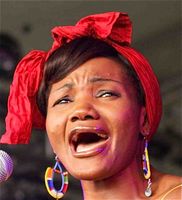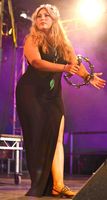 Well, obviously clothes as well - in this case a long ample skirt in pinks, aubergines, reds and golds, with a gold top and an intense russet bow in her hair and some dried fruit shakers tied to her left ankle which she used to accent her second song which was about the living spectre of AIDS which is attacking the young population of Africa.
