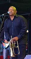 Throughout his one hour set, Hugh was on fire with his trademark fluid flugelhorn and not least his expressive singing (which went from low, gravelly tones to high screaming falsetto). His band were every bit as good as you’d expect, displaying some great guitar solos and percussion work on congas and timbales, salsa bass-lines and tracks with lots of rhythmic chanting and vocal percussion.